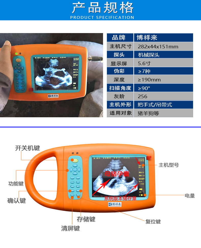 云南博祥来b超 羊用B超机价格,给母羊测孕用的B超机有四五千的,七八千的,还有上万的,多少钱的都有?它们 明显的区别就在于功能,还有图像清晰度上面,例如BXL-M3和BXL-V10这两款都是体外给母羊测孕的,BXL-V50和BXL-V60这两款配有羊直肠专用探头可以体内测孕,且有上门培训,主机配置更高,显示屏是8寸的高清液晶大屏,之前的B超机只是探头防水,这两款是整机防水的,且一次充电可以用6-7小时左右。15515670076