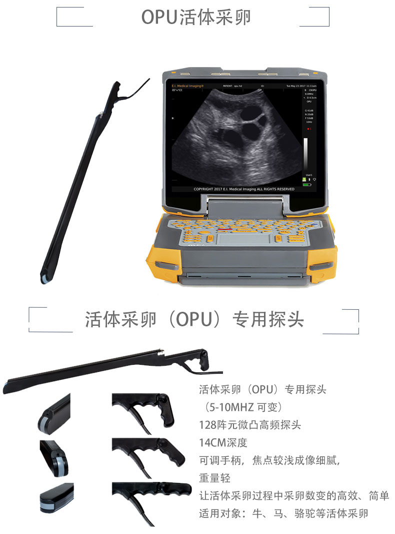 博祥来牛马活体采卵仪 实验室 科研单位专用仪器,EVO是一款的超声技术产品,它有高清的影像图像、彩色多普勒超声、远端无线遥控技术、高端超声技术、远端APP图像传输技术。使用于小动物检查、马的常规检查(肌腱、繁殖等)、动物园稀有动物检查、高清背膘眼肌面积检查、高效活体采卵引导等。强大的系统使用各种检查要求。EVO可以适用于任何时间,任何地点(包括水下作业)、任何人群。EVO适用于各种光线坏境下进行作业。