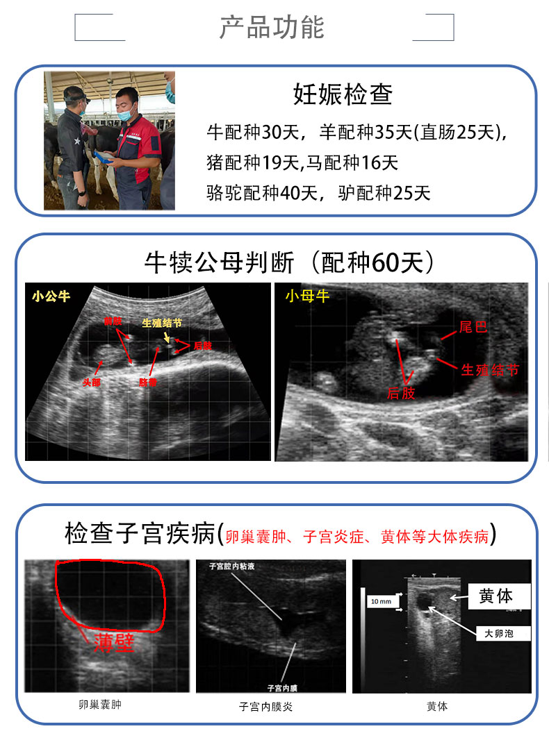 几千的牛用B超是5.6英寸液晶显示器,只有探头防水,而一万多的B超是8.0英寸高清晰液晶显示屏,整机防水、防尘,防水级别IP56;具有左右两侧按键(方便左右手操作),有专业定制遮阳板,可伸缩调节,一次充电可以工作6-7个小时以上。可配多种探头,能准确的检测怀孕、胎仔数、产科疾病、一键自动检测背膘功能;检测猪、牛、山羊、马、骆驼、犬、猫,绵羊的孕周和预产期、距离、周长、面积、体积、心率、胎重;