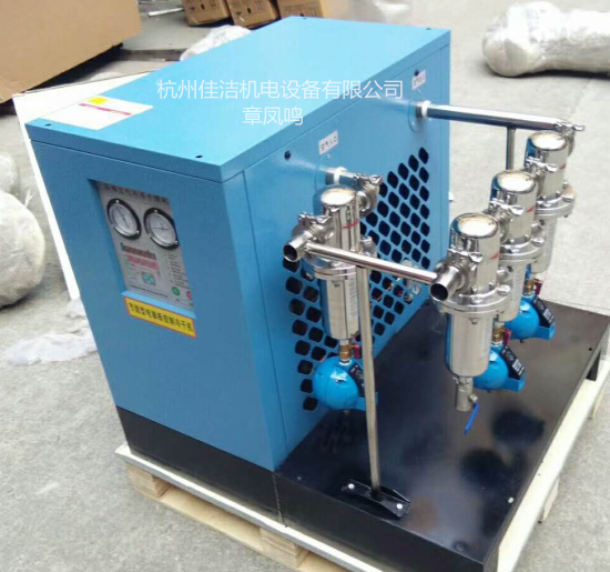 冷冻式干燥机是根据冷冻除湿原理,利y全f闭压缩式制冷系统,对经空压机排出的压缩气体冷却降温,使其中所含的大量饱和水蒸气、油雾凝结液滴,经过经气水分离后由自动排水器排出。较高温度的饱和压缩气体进入冷干机的预冷器,在预冷器中与来自蒸发器的干冷气体进行热交换,降低温度后进入制冷系统的蒸发器,与冷媒蒸汽进行d二次热交换,使本身温度降到接近于冷媒的蒸发温度,在两次降温过程中,压缩气体中的水蒸汽得以凝结成液态水滴并随气流进入气水分离器,分离下来的液态水经自动排水器排出机外,温度较低的干燥压缩气体进入预冷器,与刚进入的湿饱和气体进行热交换,使本身温度得到提高,从而在冷干机排气口得到含水量较低(即l点较低)、相对湿度也很低的干燥压缩气体。冷冻式干燥机由于工作可靠、管理方便、运行f用低l而成为各行业空压站房净化设备的s选机型。