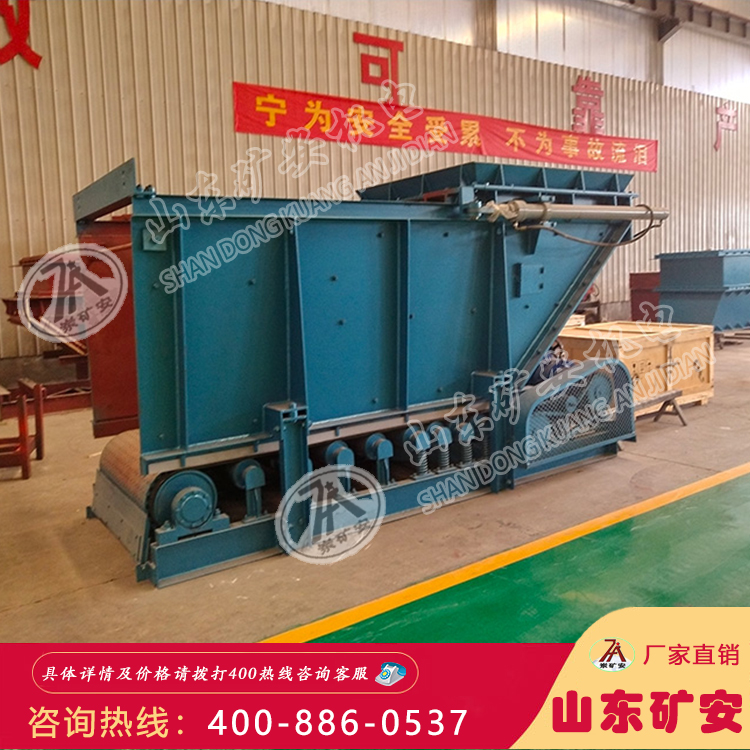 甲带式给煤机广泛用于原煤端的给煤,由于生产效率高、工作性能稳定,现市场占有率很高。动力采用电机摆线针轮减速机,其结构紧凑,运转平稳,调速范围大,可实现无级调速;环形橡胶带传动,环形橡胶带经改向胀紧轮的拉紧装置的调节可调整皮带的松紧度和跑偏度,因采用了环形机构了实现连续给煤不同与K型往复式给煤机的单向给煤,大大的提高了工作效率并且采用了16Mn合金铸造的链节作为工作面提高了设备的使用寿命并用尼龙棒销联接此结构具备了很强的耐冲击性。Kuangan03