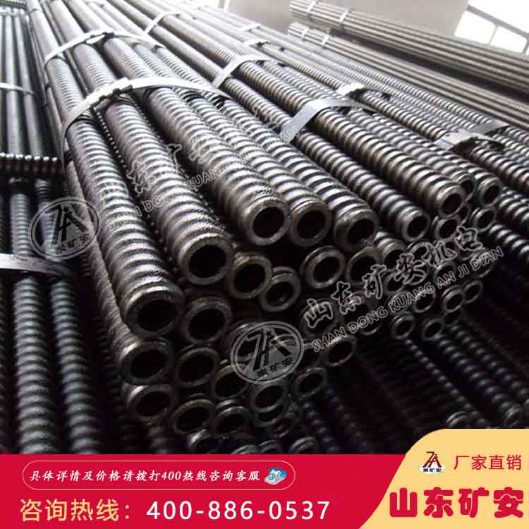 中空注浆锚杆采用中空设计,kuangan03杆体中孔作为钻进高压风水通道和注浆通道,与实心杆体相比,中空杆体设计可获得好的刚度和抗剪强度。锚杆体外表面全长标准大螺距螺纹结构,螺纹结构便于锚杆的切割和接长,与光滑杆体相比增加了锚杆体与注浆材料的粘接面积从而提高了锚固力。