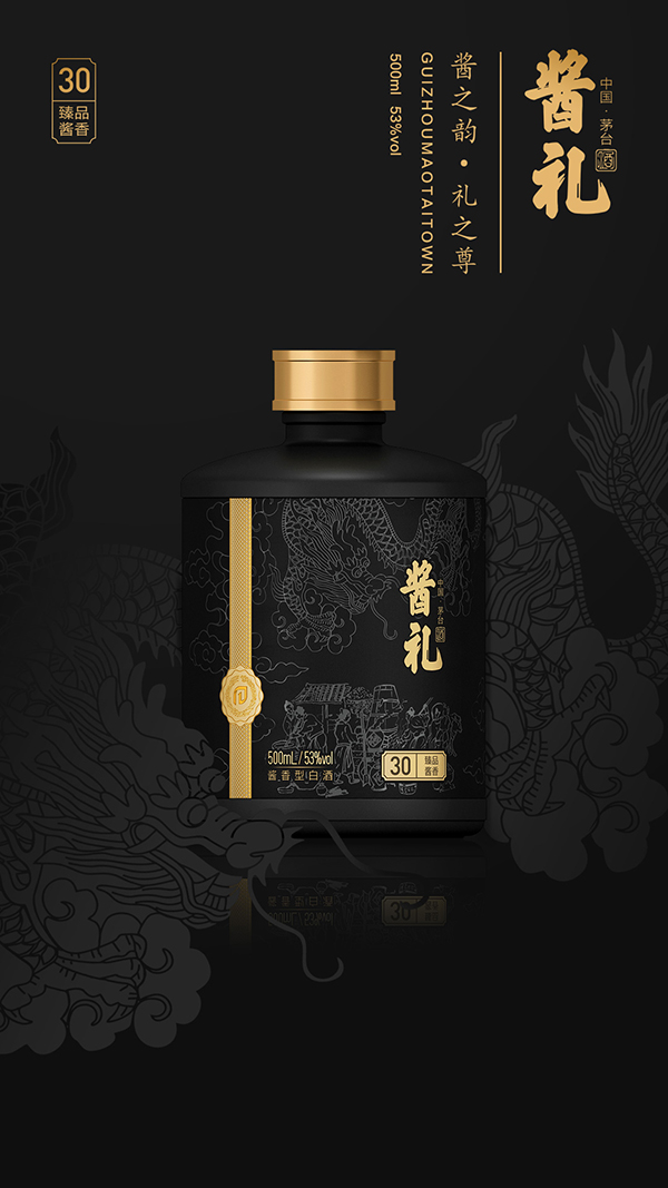 中式奢金窗格彰显古雅意趣,龙凤烫金图腾更添华贵。包装整体采用黑金两色,营造奢华尊贵质感,经典奢金茅型瓶更显古典美韵。