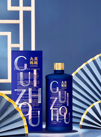 炫彩镭射烫金是包装的主体与亮点,潮流字母拼接,直指“贵州”产地佳酿。将传统古法酿酒工艺镌刻于包装之上,彰显品牌酿造匠心。克莱因蓝与奢金搭配的瓶身彰显潮流典范与大气之感。