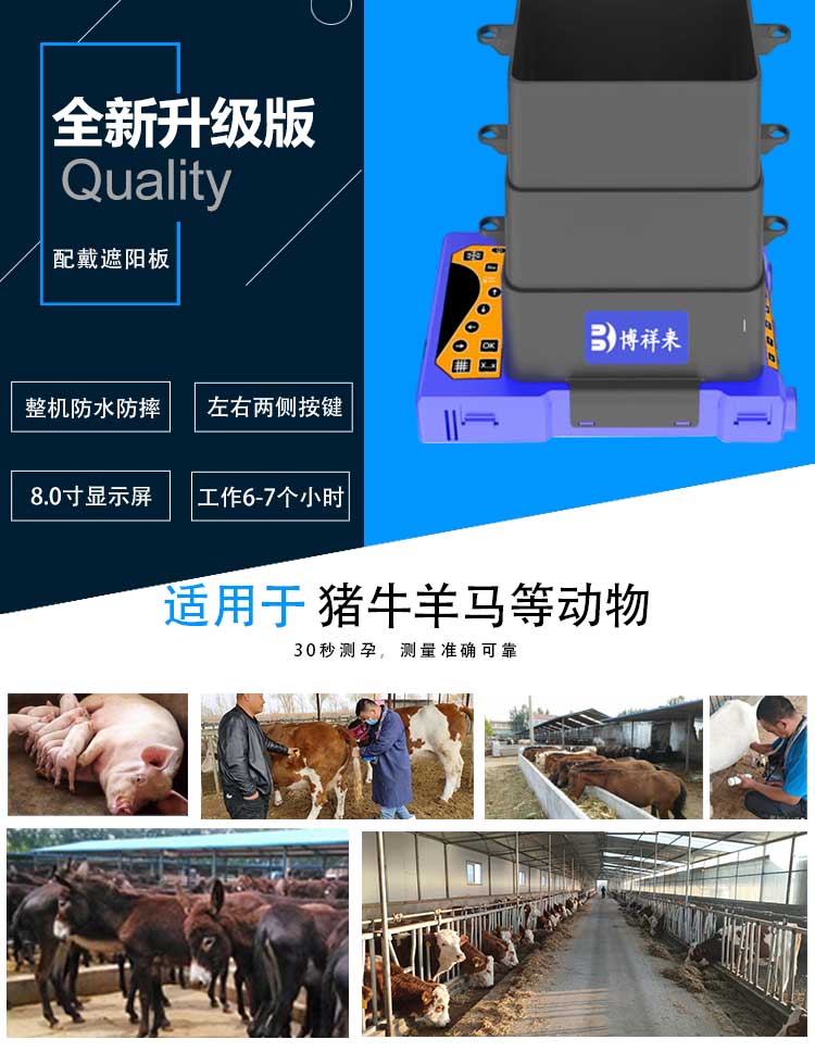 陕西猪牛羊B超机价格多少?猪/牛/羊通用的B超机需要配两个探头,例如博祥来的兽用B超机BXL-V10、BXL-V50和BXL-V60这几款都可以配多个探头的,可以同时给猪牛羊用,还有BXL-V50和BXL-V60兽用B超机可以配羊直肠探头,体内测的。15515670076