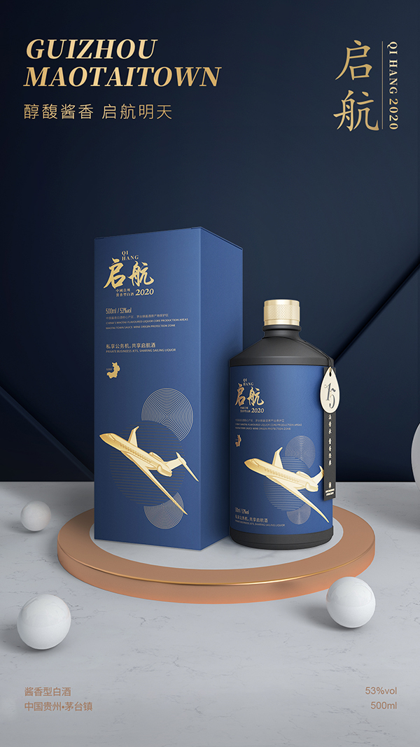 蔚蓝色的背景之下是一架遨游的金色飞机,象征着强大的军事力量,也象征着祖国的宏伟蓝图。启航2021。醇馥酱香,启航明天。