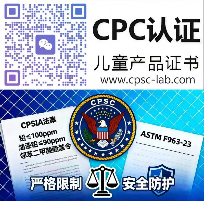 CPC证书的测试内容: 产品检测认证业务联络:18676918625(徽信同号),我司专业提供产品检测认证服务,包括CPC认证, CE认证, UKCA认证, CCPSA认证, AS/NZS ISO 8124认证, RSL Report - Phthalates, SCCP, RoHS, REACH, CPSIA, Ca Prop 65, ASTM F963, EN71, SOR/2011-17, GB 6675, TPCH, PFAS, PAHs, REACH,欢迎垂询。 |