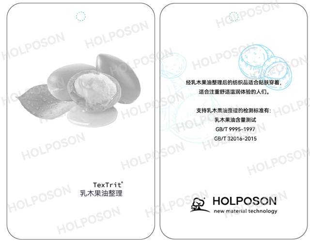 Textrit® BODY SHEA BUTTER主要成分是从非洲乳木果中提炼所得的乳木果油原料,是本公司采用独特技术将乳木果油微胶囊化后制备而成的织物用后整理加工剂。乳木果油整理剂Textrit® BODY SHEA BUTTER主要应用于:内衣,家纺、围巾、手套、袜子等贴肤纺织品。