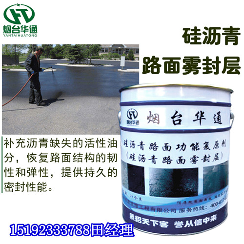 华通硅沥青雾封层是含有高技术含量的路面预防性养护材料,他首先正在材料上做“文章”,不仅要提升路面的稳定性,还必须维持,粘结力和附着力要强,并且施工要简单。经反复实验,由具有华通公司自主知识产权的特殊表面活性剂与硬质沥青基、有机硅聚合物、芳香族化合物,四种成分组成的华通硅沥青雾封层,易于施工,耐高低温,延伸率高,粘结力强,路面老化沥青,该产品干透后呈深黑色,是老旧沥青路面病害预防性养护的理想产品;与其他沥青路面翻新材料相比,华通硅沥青雾封层不仅施工简单,一次成形无需刨铣,还具有优越的渗透性、抗磨损性,以及密封效果,增强原路面憎水性,密封效果至少可达3年,有效提升路面的稳定性。