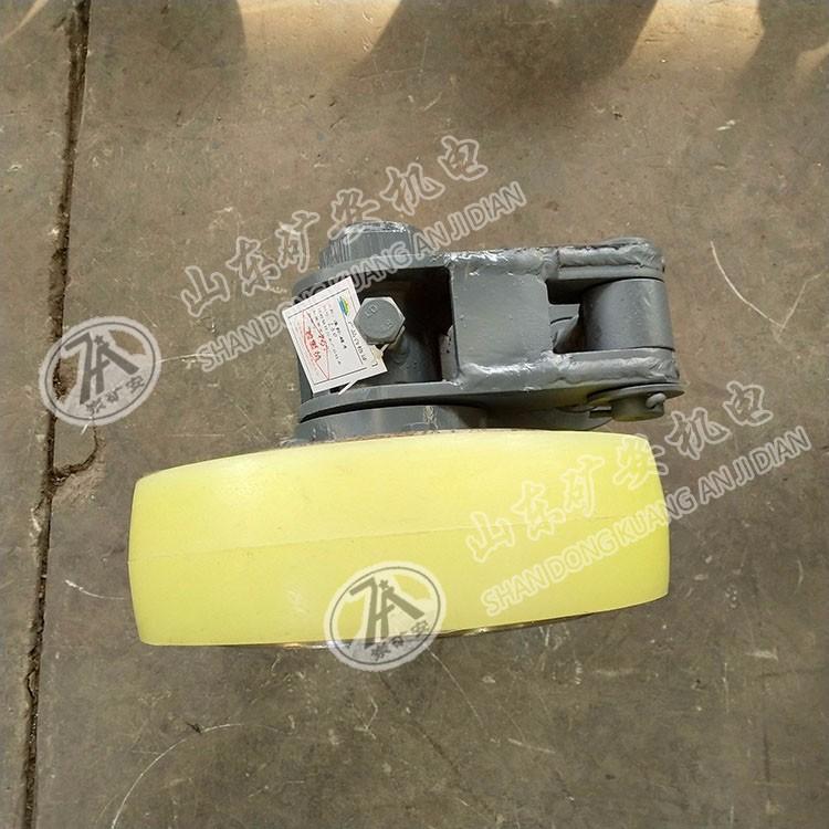 滚轮罐耳主要机构及特点:滚轮罐耳主要由底座、摆转臂、滚轮、缓冲器组成;滚轮罐耳结合我国矿山特点为目前运行中的提升容器更换新型滚轮导向装置提供了便利条件。