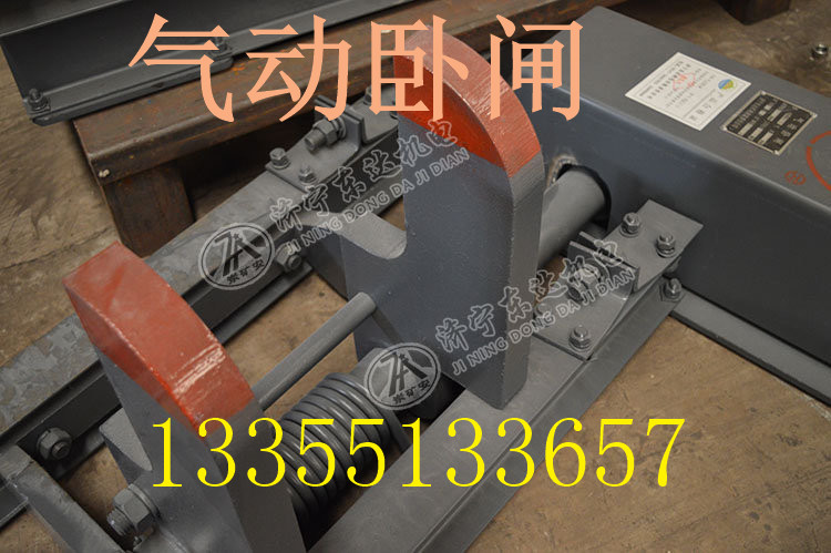 气动卧闸通过气体动力实现卧闸的关闭,依靠弹簧力自动开启,始终处于对一方向矿车开启阻车状态,阻挡此方向矿车,防止矿车自溜,当此方向矿车需要通过卧闸时,利用气动操作关闭卧闸放行矿车,当矿车通过后,卧闸自动开启,对反方向运行矿车不用操作就可通过气动卧闸,通过后自动开启,所以此款阻车器,又可叫做自复式阻车器。