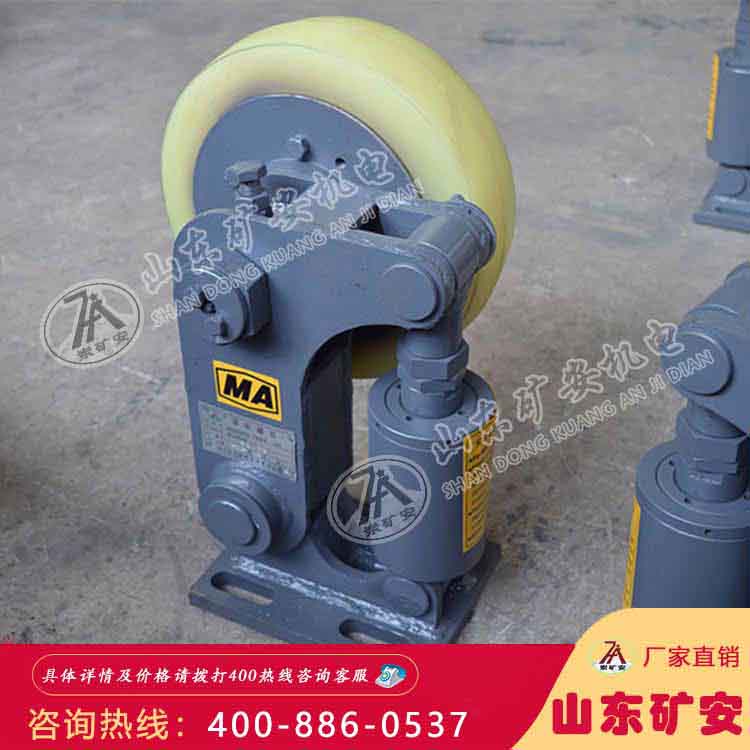 罐笼缓冲器是一种立井提升容器用滚轮罐耳,kuangan03其结构由底座、摆转臂、滚轮、缓冲器组成;滚轮罐耳结合我国矿山特点为目前运行中的提升容器更换新型滚轮导向装置提供了便利条件,广泛应用与矿山,煤炭等工业生产部门。罐道与罐耳由滑动摩擦变为滚动摩擦,因此减少了动力消耗,降低了噪音,罐道和罐耳的磨损也大大降低。从而,提高了罐道和罐耳的使用寿命。