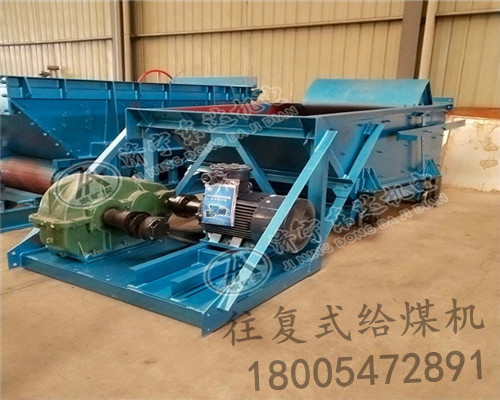 GLW590/18.5/S往复式给煤机主要由仓口漏斗、箱体、闸门、底板、托辊、驱动装置等组成。托辊用于支承底板,底板通过驱动装置驱动并在托辊上作有规律的往复直线运动,底板顺煤流方向的运动称为正行,底板逆煤流方向的运动称为逆行。当底板正行时将煤仓和给煤机箱体内的煤输送到箱体的前端,底板逆行时,箱体内的煤被箱体后部的斜板挡住,底板与煤之间产生了相对滑动,箱体前端的煤自行落下,GLW590/18.5/S往复式给煤机由于底板往复运动的结果,从而实现连续均匀的给料,这就是往复式给煤机的工作原理。