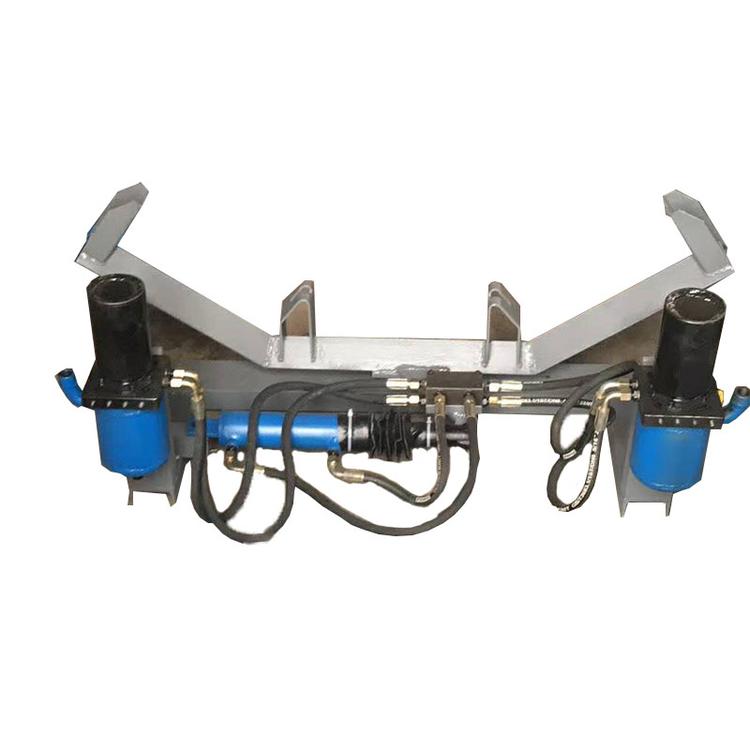 全自动无源液压调偏器,涉及一种带式输送机的调偏器。它包括上调芯拖辊、下调芯拖辊、调芯轴套、验驱轮、油箱体及阀块、调偏油缸、油箱支架、验驱轮支架、皮带机机架和槽钢座,所述油箱支架、验驱轮支架、皮带机机架和槽钢座之间固定连接,槽钢座上安装有调芯轴套,上调芯拖辊和下调芯拖辊设在调芯轴套上,验驱轮安装在验驱轮支架上,油箱体及阀块安装在验驱轮支架或皮带机机架上,调偏油缸安装在油箱支架上。本实用新型能够自动检测皮带跑偏并以调整,使皮带始终运行在设定的范围之内;不需电源、自动调整、结构简单,性能可靠、安装方便;采用全密封结构,可以在任何恶劣的环境下工作,不怕水、不怕粉尘、不损伤皮带。