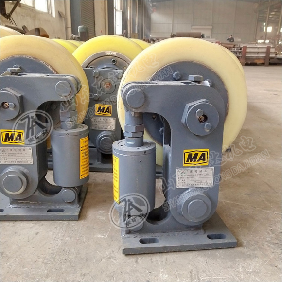 3. 缓冲器复位压力小,可有效地避免滚轮与罐道产生异常碰撞。通过杠杆传递到减震筒上,同时起到导向、缓冲与稳定作用。