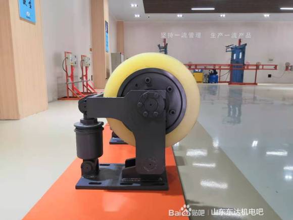 矿用滚轮罐耳用于矿山提升容器的导向缓冲,本产品采用先进的密封技术,适应淋水、煤尘等恶劣环境。轮头安装采用三锁紧结构,彻底避免掉轮头事故的发生。滚轮采用四氢呋喃-环氧丙烷共聚醚型聚氨酯浇注,具有高弹性、耐撕裂、抗水性、抗油性的优点。滚轮磨损补偿调节采用左、右旋螺杆,调节迅速便捷。机座、摆架采用优质钢板焊接成型,体积小。滚轮罐耳主要由轮轴、支架、缓冲装置、底座等组成。