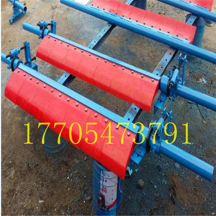 头道清扫器利用橡胶体本身的弹性性能,可自动调节清扫器刮板与输送机胶带之间的接触压力,橡胶体的缓冲作用,保证了刮板与运行的胶带受力在一定合适的范围之内,使得清料既干净,又不损坏胶带。
