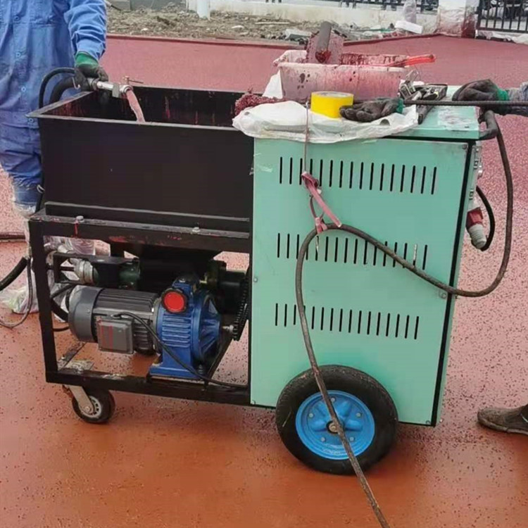 塑胶场地喷涂机是用于喷涂室内外的塑胶场地弹性面层。其工作原理是:采用一台料泵将液体塑胶和固体胶粒混合物泵入喷枪,同时由一台空压机输出的压缩空气进入喷枪,在喷枪中混合,并将雾化的混合物喷涂于塑胶场地表面。