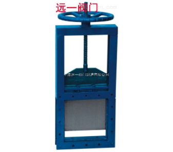 主要由框架、闸板、丝杆、螺母等零件构成,用手转动手轮使丝杆带着丝杆螺母和闸板沿水平方向往复运动,达到闸门的启闭目的。