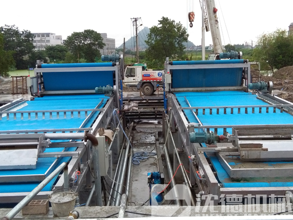 洗沙泥浆对辊压滤机在安装的时候,需要注意设备安装的位置,做到设备安装在平整的混凝土上,此外还需要将进料端的止推板机脚用地脚螺栓固定,将地脚螺栓定位后用两只螺母锁紧,需要注意的是,安装人员要保证横梁与止推板需要保持垂直,按照设备的负荷情况进行设计,地面上留有空位,并两次灌浆,周围要有足够的操作运行空间,此外还需要保证气压站能够正常的工作,安装后要准备好各项安装设备,并且配上过滤压力显示表,方便实现观察压滤机的使用情况,确保在正常范围内操作运行,在气压站的油箱内注入清洁的机械油,将温度控制在5℃。安装好设备后,需要接通电源试机,若正常运行,压力表平稳上升,气压系统也没有出现泄流的现象,就可以根据机型的大小调整压力,检查好各项设备,方便下次的持续操作运行。