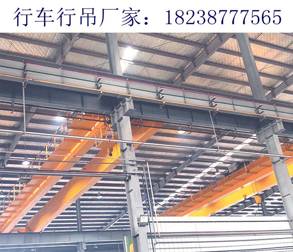 河南开封行车行吊销售厂家生产的悬挂起重机可直接安装在现有厂房的屋顶钢结构的工字钢上,因而不必安装承轨梁和起重机轨道,这样客户就可以降低成本,并把全部厂房面积应用于生产。并通过使用侧端悬臂,使小车的行驶超出起重机跨度,使得客户能够更有效地利用厂房面积。