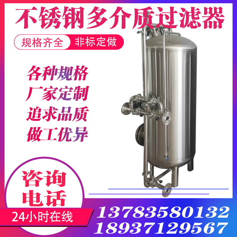 不锈钢过滤器,由壳体、多元滤芯、反冲洗机构、和差压控制器等部分组成后由不锈钢过滤器壳体内的横隔板将其内腔分为上、下两腔,上腔内配有多个过滤芯,这样充分利用了过滤空间,显着缩小了过滤器的体积,下腔内安装有反冲 洗吸盘。工作时,浊液经入口进入过滤器下腔,又经隔板孔进入滤芯的内腔。大于过滤芯缝隙的杂质被截留,净液穿过缝隙到达上腔, 然后从出口送出。