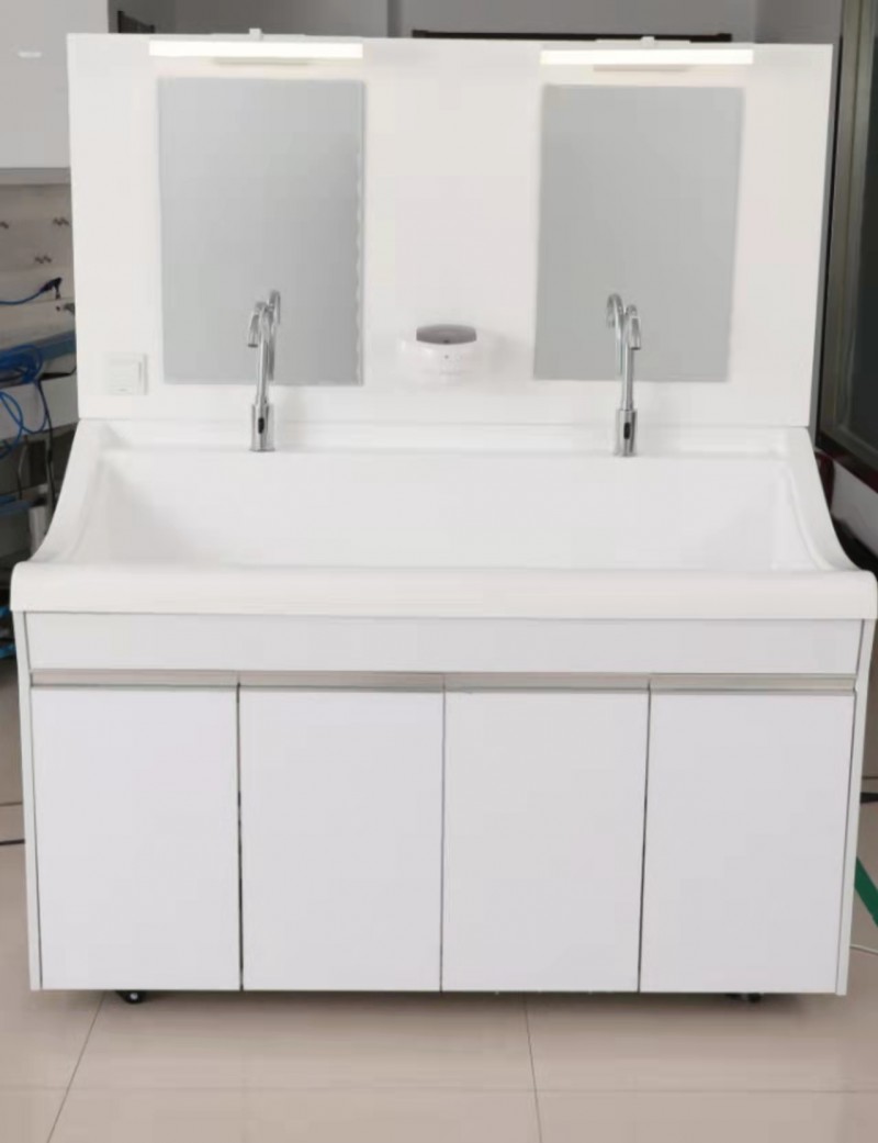 高分子洗手池材质特点:采用高分子材料一次吸塑成型,出水方式有:感应式、膝控式、脚踏式和手动开关,一台洗手池可客户要求选择单一出水方式或多种出水方式。洗手池分高背和低背,高背总高度1800mm,配有美容镜,照明灯,皂液器,可按客户要求配置烘手器和热水器。低背板无配置。