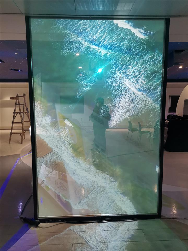1: 全息透明膜透明膜并非完全透明的,透明度约90%,主要用于橱窗展示区贴于透明玻璃上。优点::投影时室内室外均能看到投影图像,不放投影时外面行人或路人能看到室内物品或摆设。缺点:外界光线干扰比较大,容易降低投影画面清晰度。