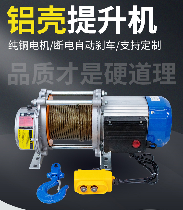 小型电动提升机标准速度一分钟15米,可定制速度一分钟25米、30米,,这是单速,不能进行调节速度,有些用户的需要并不很过分,要求速度可进行随意调节,变频器实现了调节速度,如果慢速起吊重物吊重基本没有变化,如果是快速起吊,吊重起码会减半,这就是快速与慢速的变化。