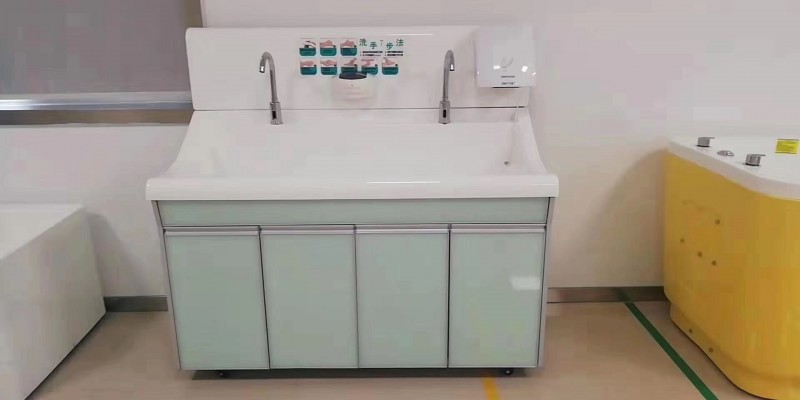 高分子洗手池材质特点:采用高分子材料一次吸塑成型,出水方式有:感应式、膝控式、脚踏式和手动开关,一台洗手池可客户要求选择单一出水方式或多种出水方式。洗手池分高背和低背,高背总高度1800mm,配有美容镜,照明灯,皂液器,可按客户要求配置烘手器和热水器